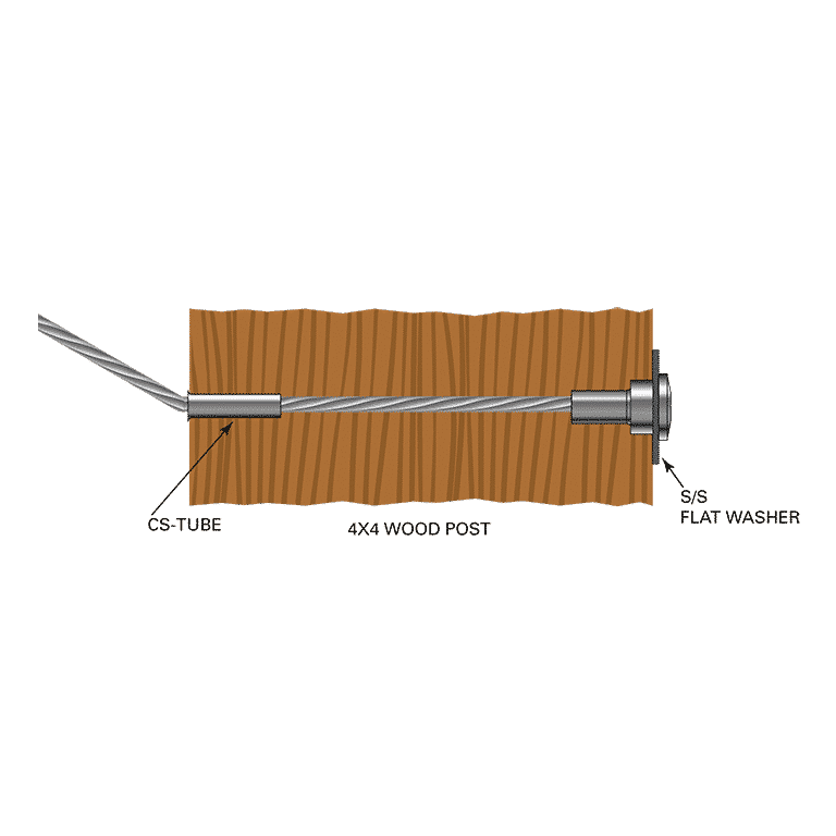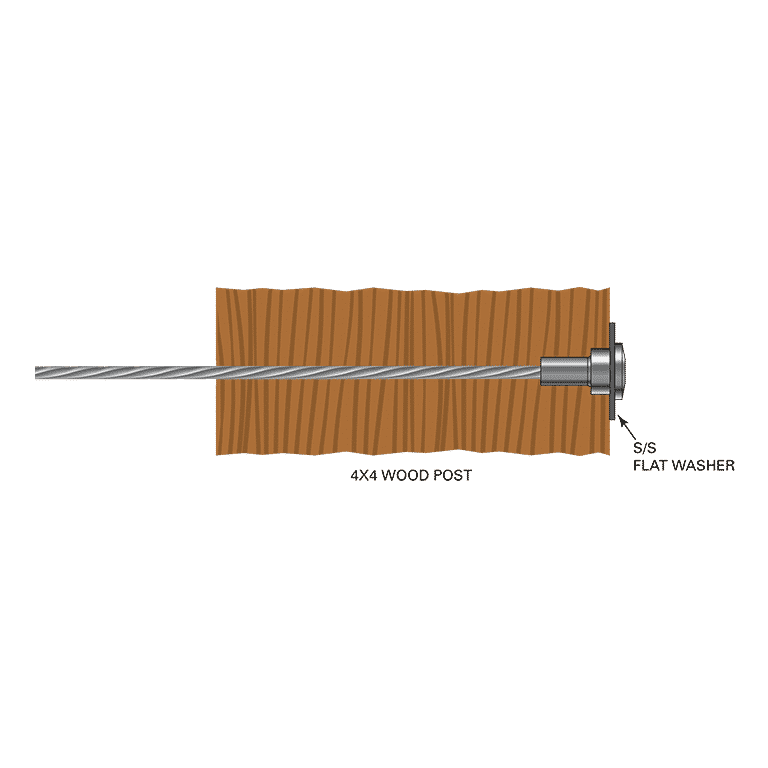 This fitting installs into a hole drilled through the face of the post (to accommodate the cable at minimum) and a hole through the back side of the post to accommodate the fitting. It also requires that you have at least 2” of clearance on the back side of your end post so you have enough workspace to feed the rest of the cable through the post prior to pulling the Radius Ferrule into its final position. (The cable would likely be attached to the Radius Ferrule prior to installing it through the back side of the post). We recommend using a stainless steel flat washer between the shoulder of the fitting and the mating surface of the wood post.